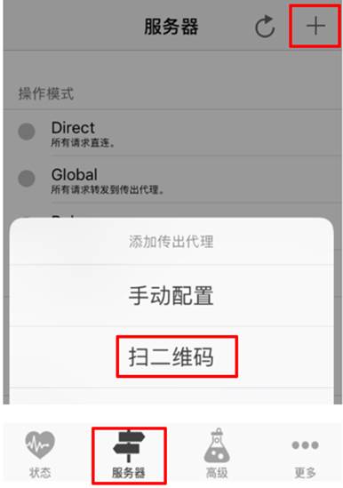 打开苹果设备上安装好的Kitsunebi,依次点击“服务器”-> 右上角的“+”标志